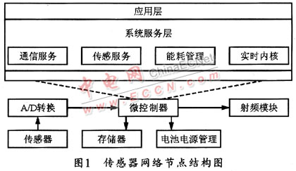 在软件设计方面,本系统以专用嵌入式实时操作系统为依托,来管理、协调传感器节点各硬件部分的工作。上层应用以及各层的通信协议都以节能为中心,必要时可以牺牲其他的一些网络性能指标来获得更高的电源效率。图1所示是一个传感器网络节点的基本组成。