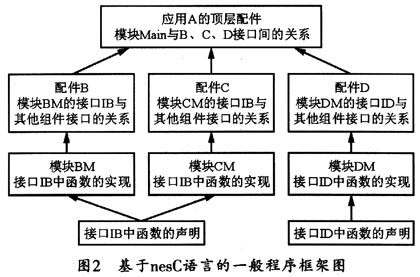 TinyOS和在其上运行的应用程序可以看成是一个大的“执行程序”,它由许多功能独立且相互有联系的软件组件构成,图2所示是nesC语言的一般程序框架。该系统中的一个组件一般会提供一些接口(假定组件名为ComA),接口可以被认为是这个软件组件实现的一组函数的声明,是单独定义的一组命令和事件,其他组件通过引用相同接口声明来使用这个组件(ComA)的函数,从而实现组件间功能的相互调用,即组件的接口是实现组件间互连的通道。但若组件中实现的函数并未被它在接口中说明,就不能被其他组件所使用。nesC语言的定义中存在两种不同功能的组件:其中组件接口中的函数功能专门在模块的组件文件中实现,而不同组件之间的关系则是专门通过称为配件的组件文件来描述的。