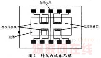 图1是由清华大学设计、中国电子集团第13研究所加工而成的微流体陀螺仪。它是利用气体流速方向在哥氏加速度作用下发生偏转的原理,采用微机械加工工艺制作的。此微流体传感器由隔热腔体、加热器和两对对称的温度传感器构成。加热器和温度传感器悬在腔体上面。加热器加热使其周围的气体温度升高,密度减小。在重力加速度的作用下,腔体内的气体发生对流。位于加热器相等距离上的一对温度传感器用来测量加热器两边的温差。器件封装在密封的隔热管壳内,防止外部气流和温度对器件的影响。敏感方向无哥氏加速度时,腔体内的加热气体只在重力加速度的作用下发生对流,如加热器水平方向上两边相等位置上的温度相等,两对温度传感器的输出相等。敏感方向上有哥氏加速度时,腔体内的气体在重力加速度和外加角速度的联合作用下交替膨胀,加热器水平两边相等位置上出现温度差,两对温度传感器的输出就产生差异。若两对温度传感器采用热敏电阻,可与外接的两对参考电阻构成电阻电桥,这样通过电桥的输出电压信号变化便可以测量出外界输入角速度的值。