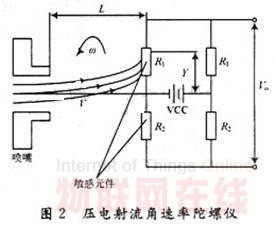射流气体陀螺是利用强迫对流气体的气流束 (层流)和敏感元件的热阻效应来测量角速率的。目前,采用MEMS技术制作的射流微陀螺并不多。报道的射流气体微陀螺主要由压电驱动泵、循环气流通道及腔室、微喷嘴和热敏元件等组成。它结构简单,无活动检测质量,抗过载能力强,成本低,寿命长。它是在哥氏力定理基础上发明出来的,它通过压电泵驱动气体循环,当陀螺有角速度信号输入时,利用哥氏力使循环气流束偏转来实现角参数的测量。循环气流是由压电泵激励而产生的气体层流束(射流),信号由两根平行的热敏丝R1,R2敏感。当输入角速度为∞时,由于哥氏力的作用,射流束偏离原来所在的射腔的中心位置(见图2),偏离的角度和方向决定于输入角速度,这样通过测量外围电路电压的变化便可测量出相应的加速度值。
