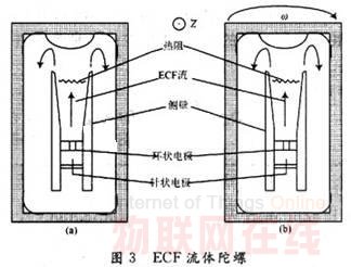ECF(electro-conjugate fluid)流体是一种新型的流体材料,当在流体两端的电极上加上几千伏的电压时,ECF流体可以产生很强的流动,利用ECF流体的这种特性可以制作基于 ECF的流体陀螺。由日本东京工业大学制作的这种流体陀螺如图3所示,其基本原理如下:在容器内部充满ECF液体,当在如图3所示的电极上加上上千伏的电压时,便会产生很强的ECF液体冲击流,并往图3(a)所示方向流动。当给陀螺如图3(b)所示以顺时针方向旋转的角速度时,ECF的流动便向左边偏移,左右流体的流动变化使得顶部的热阻阻值发生变化,进而可以检测出外部的电压值的变化,通过测量外部电压的变化便可以测量出外界输入角速度的值。