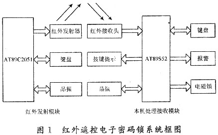 系统主要由红外发射模块和本机处理接收模块两部分构成,系统总体设计框图如图1所示。发射模块和本机处理接收模块的核心分别采用AT89C2051和AT89S52单片机。红外信号的收发通过串口进行通信,两部分的串口工作方式及通信波特率的设置相同。