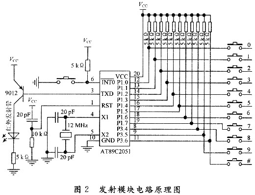 红外发射模块仅仅是一手持遥控器,由AT89C2051单片机及键盘电路、按键K及红外发光二极管组成。发射电路原理图如图2所示。