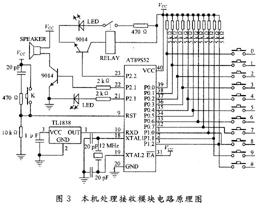 本机处理接收电路的控制核心是AT89S52单片机。外接键盘电路、红外接收电路、开锁电路、报警电路和按键指示电路等,电路原理图如图3所示。