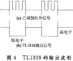 红外接收电路中使用一体化红外接收头TLl838接收红外信号。TLl838集红外接收和放大于一体,不需任何外接元件,就能完成从红外接收到输出与TTL电平兼容的所有工作,而体积和普通的塑封三极管大小一样。TL1838的输出波形如图4所示。当接收到频带内的红外信号时,TLl838会输出低电平,否则数据高电平,从而将“时断时续”的红外信号解调成原来的连续方波信号。