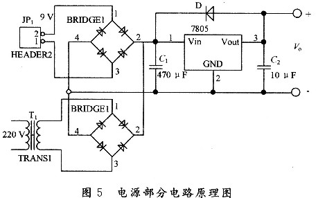 电源部分使用LM7805芯片进行稳压后提供单片机5 V的电压,其电路如图5所示。主要采用家用交流电,同时采用9 V电池作为备用电源。这样做的优点是,即使断电也不至于无法开锁。