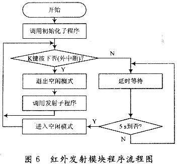 发射模块的编码与调制工作是由软件编程实现的。当按键K按下时,密码信号依次送往数据缓冲器SBUF,然后利用“0”电平调制、“1”电平不调制的方法,将二进制信号调制成频率为38.5 kHz的间断脉冲串信号,通过P3.O口输出,驱动红外发光二极管,最后以波长940 nm的红外光发出红外遥控信号。红外发射模块程序流程图如图6所示。