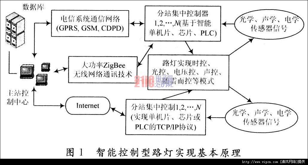 智能控制型路灯是运用先进的通讯手腕,计算机网络技术、自动控制技术、新型传感技术与自动检测技术等构成的无线监控系统,高速精确地对路途照明、城市灯饰工程、广场照明、桥梁和隧道照明等系统举行智能监控,完成对远程路灯和电源施行遥控、遥测、摇监、遥视、摇信等功用,便于明白路灯运转情况以及它的维修和保养,能提高路灯运转质量和效率,为动力浪费和发明浪费型社会打下根本。路灯智能控制系一致般由控制中心主站、各点测控分站、通讯系统三大局部组成。主站首要由计算机和网络构成,担任维护、控制整个系统的运转,其兼容性和容量大小可灵敏配置;通讯普通采用无线或无线与有线相结合的方式,当前无线技术有GSM 短信息网、GPRS数传电台、CDPD公共无线数据网,或使用单片机完成路灯控制器的TCP/IP协议(完成自己数据的高速传输和及时控制)等技术;而各分站点议决装置单片机或新技术配备(如LONWORKS技术)构成其控制器,从而抵达与主站通讯、接受命令、执行开关、控制电压、控制时间、反应数据信息等功用。智能控制型路灯完成流程能够是多种多样,但无外乎都是:主站计算机控制中心+适宜的通讯手腕或方式+各分站集中智能控制器+路灯控制系统的方式,其普通完成原理如图1所示。随着科技和信息产业的成长,图中任一个环节完成起来都能够采用其他方式或办法,在此不赘述。