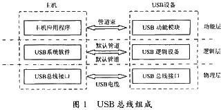 USB总线主要包括主机和设备、物理构成、逻辑构成以及客户软件与设备功能接口的关系4个部分,图1展示了USB总线组成关系。
