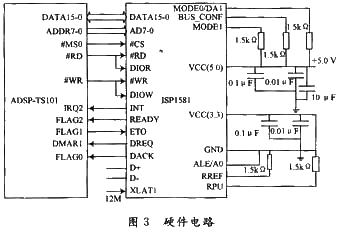 由ADSP-TS101和ISP1581构成的USB 2.0接口电路如图3所示。其中ADSP-TS101在系统中同时完成信号处理和充当微控制器完成对ISP1581的控制。ADSP-TS101和ISP1581以通用总线的方式连接,即数据总线和地址总线分离的方式。ISP1581的片选信号连接到ADSP-TS101的MS0,映射到ADSP-TS101的地址空间为0X8000000~0X80000FF,TS101通过对这些地址上的寄存器进行读写来控制ISP1581,完成与上位机的USB传输。ISP1581的中断输出引脚连接到ADSP-TS101的中断请求输入引脚IRQ2,通过中断方式与DSP通讯。ISP1581的复位可通过硬件和软件触发,硬件复位引脚连接到系统复位信号,系统上电复位或热复位时同时复位ISP1581。