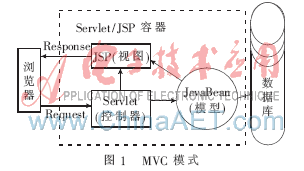 使用MVC模式(如图1)设计Web应用程序非常有效。其结合了JSP和Servlet两种技术,Servlet可充当Controller的角色,JSP可以充当View层的角色,即采用JSP显示页面内容,但它并不处理任何的业务逻辑,而采用Servlet进行数据处理以生成动态内容。