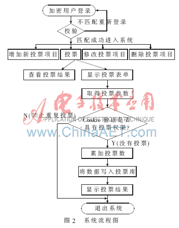 基于网格的电子投票系统,设计非常直观,用户很容易看出投票的情况,并且只有合法用户才能进行有效投票。该系统分为多个功能模块,主要有以下功能:用户登录、校验、增加新投票项目、修改投票项目、删除投票项目、投票、查看投票结果、退出系统。本投票系统还具有防止重复投票的功能。系统流程图如图2。