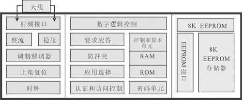 射频通信接口部分由与天线导入的射频通信接口、整流、稳压、调制/解调器、上电复位和时钟等部分组成;数字逻辑控制模块由要求应答、防冲突、应用选择、认证和访问控制、控制和算术单元、RAM、ROM、密码单元等部分组成;E2PROM存储器部分由接口和8kb的 E2PROM存储器组成。