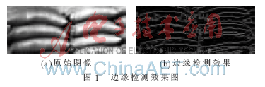 在数字图像中,边缘点和噪声点均属于图像中灰度突变点,因此在边缘检测中,边缘定位能力和噪声抑制能力是相互矛盾的,有的算法边缘定位能力比较好,有的算法抗噪声能力比较强,每种算法都有各自的优缺点。参考文献针对袋装粮图像的特点,对现有的Laplace边缘检测算子的模板进行了适当的改进,通过设置更加合理的Laplace模板权值参数,提高了袋装粮图像边缘检测的精度,所检测到的边缘信息更加丰富和清晰,检测效果如图1(b)所示。