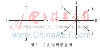 数字图像是按照固定间距的网格进行采样的,因此最简单的链码是跟踪边界并赋给每两个相邻像素的连线一个方向值。常用的有4方向和8方向链码,如图3所示。在数字图像中,任意一个像素点周围均有8个邻接点,而8方向链码正好与像素点的实际情况相符,因此能够准确地描述中心像素点与其邻接点的信息。在8方向链码中,链码沿着数字曲线或者边界像素以八邻接的方式移动和编码,相邻两个像素的偏移量用数字0"7表示,码值加1,其所指的方向则按逆时针旋转45°。