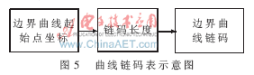 采用8方向链码描述曲线S得到的数组Lianma[]={0,6,0,7,0,6,5,4,4,3,2,2,2}。从图中可以看出,只要知道边界任意一点的坐标和其他点的链码值,就能准确地描述出区域的边界。为了得到一个完整的边界链码,便于后续处理(如链码的存储、特征的提取、重构等),可将曲线起始点坐标、曲线链码和链码长度一起存放在一个链码表中[10],链码表格式如图5所示。