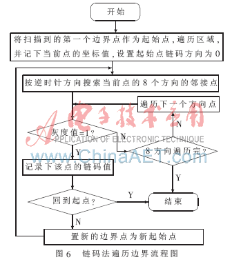 针对已经进行边缘提取并进行二值化后的袋装粮图像,用行扫描法得到粮袋边缘的最左上角的边界点作为跟踪的起始点,采用8方向链码搜索边缘,边界链码跟踪袋装粮图像边界轮廓算法步骤如图6所示。
