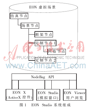 EON Studio是美国EON Reality公司开发的一套模块化多用途的三维交互式仿真软件开发工具,它能够让用户自定义行为及交互方式,也能够进行仿真测试及实时更改测试的参数,可应用在设计、研究、制造、生产、教育、训练与维护等领域。EON Studio基于最新的PC技术,是在OpenGL图形标准和微软的DirectX多媒体功能的基础上建立起来的。通过与OpenGL和DirectX的联系,使得利用EON所开发的应用程序在将来图形卡渲染能力加强的同时其渲染效果也会得到提高。EON强调资源(软件/硬件)的集成与延展、基于Web的交互式三维文件的安全维护、逼真度及后台数据库的结合。EON Studio技术和VRML技术在结构上十分相似,可以认为,EON Studio技术是VRML技术基础上的延伸和扩充,其系统组成如图1所示。