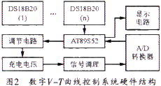 本设计选用美国Atmel公司的增强型Flash单片机AT89S52作为主处理器来完成主要的测控任务.A999S52内嵌的8 KB Flash ROM可在软硬件上兼容AT89C52,但其最大的特点是集成了ISP接口.因而可直接在目标板上进行在线编程。另外,设计中选用DALLAS公司的DS18B20作为温度测量单元,其单总线上挂接的DS18B20采用外接Vcc(而未用寄生供电),进行多点测量;模数转换采用ADI公司的AD574,精度为12 bit。其系统硬件组成如图2所示。