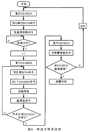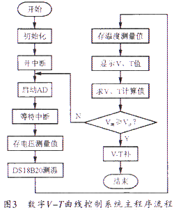 本系统程序主要包括主程序、读出温度子程序、温度转换命令子程序、计算温度子程序、显示数据刷新子程序等。编程时必须严格按照DS18B20的时序规定进行。尤其需要注意的是,在多点温度测量中,由于多个DS18B20挂在一条总线上,为识别不同的器件,在系统安装之前,应将主机逐个与DS18B20挂接,以读出其序列号。具体是由主机先给DS18B20发一个复位脉冲,在DS18B20发回响应脉冲给主机后,主机再发读ROM命令(代码33H),并发一个15μs左右的脉冲,接着再读取DS18B20序列号的一位,并用同样方法读取序列号的每一位。其V-T曲线控制系统主程序和测温子程序分别如图3和图4所示。