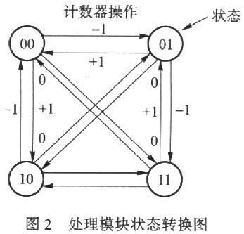 综合上述分析,可以作出处理模块状态转换图(见图2),其中“+”、“-”分别表示计数器加/减1,“0”表示计数器不动作.