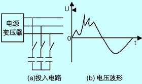 许多用户都在变电所内采用集中电容补偿的方法来提高功率因数,在补偿电容器投入和切出的暂态过程中,网络电压有可能出现很高的峰值,如图2所示,其结果是可能使变频器的整流管因承受过高的反电压而击穿。