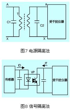 变频器输入侧的谐波电流常常从电流侧进入各种仪器,成为许多仪器的干扰源。针对此情况,应在受干扰仪器的电源侧采取有效的隔离。方法有电源隔离法和信号隔离法,如图7和图8所示。