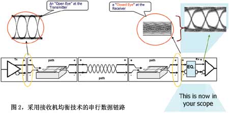 在物理层,当信号通过信道(如:电缆、PCB背板等)时,因信道损耗和其它失真改变了接收机上的NRZ数据信号形状,把所需的方波变成严重失真的闭合眼图波形,如图2所示。如果采用传统的测试方法将会得出系统无法运行的结论,但事实上链路依然运行良好。究其原因是系统中采用了接收机均衡器。均衡器使眼图张开(如图2中蓝色部分),允许区分逻辑状态高和逻辑状态低。