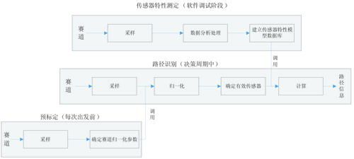 考虑到赛道差异以及传感器温漂对传感器电压整体变化产生的影响,每次赛车出发前需要进行赛道预标定,从而为下面算法路径识别部分中的归一化处理提供准确的归一化基本参数。
