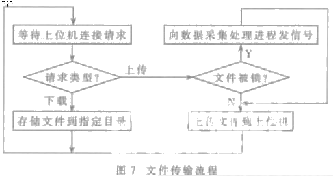 响; 而进程各自占有一份内存空间, 可以增强系统的稳定性, 但是多进程增加了系统开销, 进程间通信复杂。为此,根据实际情况,考虑到系统稳定性, 本系统采取两者相结合的方式分别完成数据采集处理及文件传输功能。