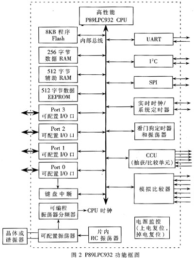 P89LPC932是飞利浦公司生产的一款单片封装的微控制器,适合于要求高集成度、低成本的场合,可以满足多方面的性能要求。它采用了高性能的处理器结构,指令执行时间只需2~4个时钟周期,是标准80C51器件的六倍;集成了许多系统级的功能。其功能框图如图2所示。