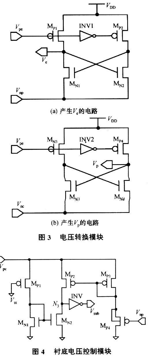 共享技术电荷泵的Ve、Vp时序由图3所示的电压转换模块产生。图3a可以实现Ve在VDD和vnp之间的转换,而图3b实现Vp在VDD和- 4.8V之间的转换。结合图2,其工作模式见表2。当控制信号Vpe为高时,电荷泵产生-8V高压,而当Vpe为低时,电荷泵产生-3.3V高压。