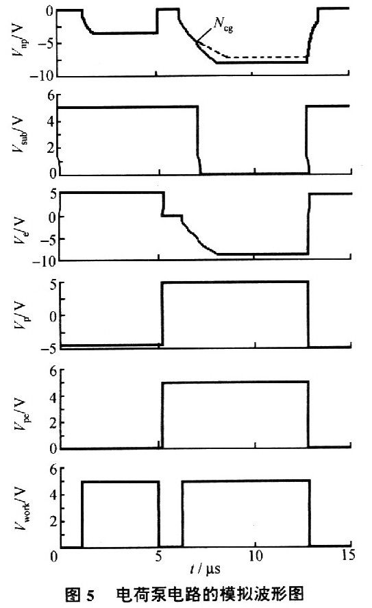 图5是电荷泵电路的模拟波形图。其中Vwkrk是控制信号,当Vwork为高时,输入时钟CKl和CK2,电荷泵电路开始工作。当Vwork为低时,时钟停止输入,电荷泵电路不工作,只是通过泄放通路把输出端Vnp的电荷泄放到地。从图5可以看到,当Vpe为低时,Vp为-4.8V,而Ve等于5.OV,电荷泵电路的输出电压Vnp等于-3.3V。当Vpe为高时,Vp等于5.0V,而Ve和Vnp的电压一致,最终系统输出电压Vnp等于-8V。而且可以看到,当负高压电荷泵工作一段时间,Vnp达到-5V后,Vsub的电压将由5.0V变为0V,这降低了PMOS管Mp6-Mp8的衬偏效应,使得高压输出端Vnp的波形上出现一个拐点Ncg,而且拐点后的电压下降的速度明显加大并最终达到-8V(其中虚线部分是没有采用衬底电压控制模块时Vnp的波形,其电压最终只能下降到-7V),这使得电荷泵的增益提高了大约14%。