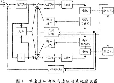 烈马达驱动系统采用的足单速度环体制。其原理如图1所示。由图1可以看出,对单速度环双马达驱动系统来说两个马达共用一个速度调节器,从两个马达的测速机输出取信号求和后作为速度反馈信号来构成趣度环,从而把两个独立的电流环闭在同一速度环内。