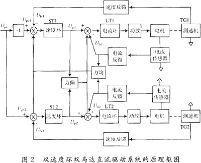 双速度环双马达直流驱动系统的原理框图如图2所示。由图2可以清楚地看到,双速度环双马达直流驱动系统中的两个电流环及两个速度环均是完全独立的。