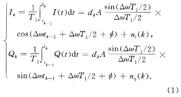 其中:tk=tk-1+T1,T1为预检测积分时间,选为一个C/A码周期;A为信号幅值;dk以为积分周期内信息比特的符号;△ω为接收信号载波与本地载波间的频率差,φ为接收信号载波与本地载波间的初始相差;ni(k)、nq(k)为噪声项。