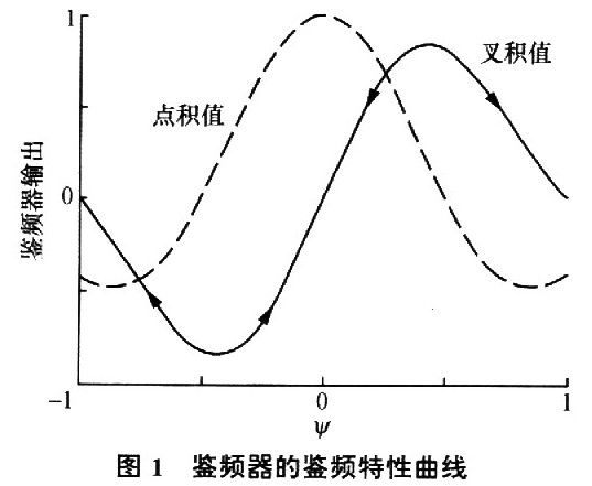 图1为鉴频器鉴频特性曲线(其中ψ=△ωT1/π)。频差估值经环路滤波器反馈回本地载波NCO(number controloscillator),逐渐消除本地载波与接收信号载波间频差,完成频率牵引过程。