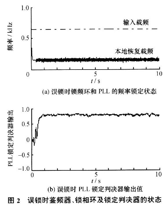 其中:tk-1=(k一1)T1,φs为输入信号载波与本地恢复载波的相位差。当鉴相器趋于稳定时,φs收敛于π/2,两载波间存在固定的相差。根据锁相环的特性,固定的相差干π/2正好对应输出固定的角频率偏差π/T1,锁相环仍将锁定在误锁频率点上。