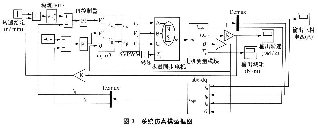 定子电阻R=2.875 Ω;电枢电感Ld=Lq=8.510-3H;磁通φ=0.175 Wb;极对数p=4。并且设置电机在O.2 s时转矩由4 Nm突变为7 Nm;转速给定为700 r/min。图2给出了系统仿真框图。