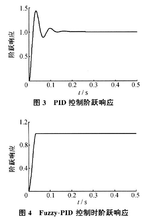 为了比较PID控制和Fuzzyr-PID控制性能,图3和图4给出了分别采用PID控制和Fuzzy-PID控制时的速度阶跃响应。