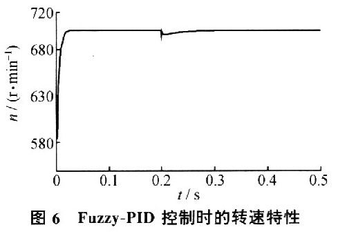 由图可以看出,当采用PID控制时,速度出现超调和振荡现象,这将在电机启动过程中造成很大的冲击;采用Fuzzy-PID后,无超调和振荡现象,鲁棒性好,系统响应速度明显改善。