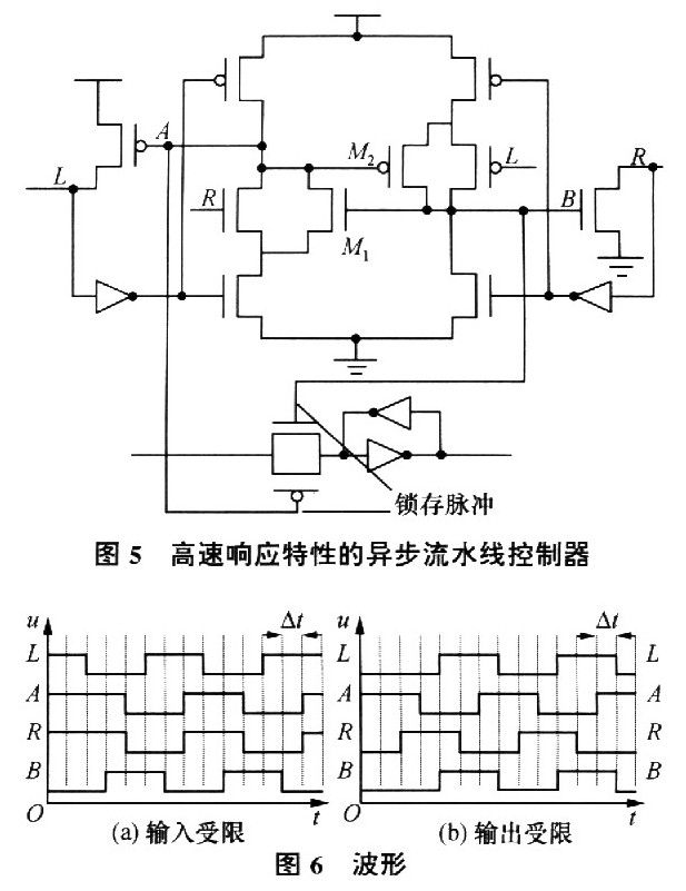 下面具体介绍该控制器的工作过程:在初始状态时,节点L、R和A均为高电平,节点B为低电平,此时晶体管M1、M2截止。当前一级电路将L节点驱动为低电平时,经过一级门延时,节点B被驱动成高电平,经过两级门延时节点A被驱动成低电平,节点R被驱动成低电平。在节点A为低以后,L节点通过PMOS管重新被拉成高电平,表示前一级电路可以发送新的数据。当R为低电平后两个门延时,B节点被重新驱动成低电平,同样在L为高电平后两个门延时,A节点重新回到高电平;当A是高电平,B是低电平时,L和R节点浮空,该流水级处于等待前一级的请求信号和后一级的应答信号状态。图6a给出了以上描