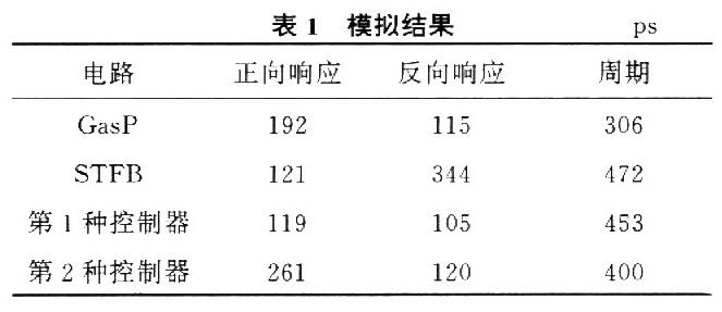 使用TSMC O.25 μm逻辑工艺库对文中的4个电路进行如下Hspice模拟:反相器的尺寸分别为Wp=1.4 μm,Wn=0.6μm,其他逻辑门的尺寸选择以与反相器具有相同驱动能力为原则,输出级MOS的尺寸为反相器管子尺寸的两倍。在GasP电路中,自复位与非门中PMOS管尺寸为Wp=2.8μm,STFB电路或非门中NMOS管的尺寸为Wn=0.9μm。表l给出了4个控制器的模拟结果,