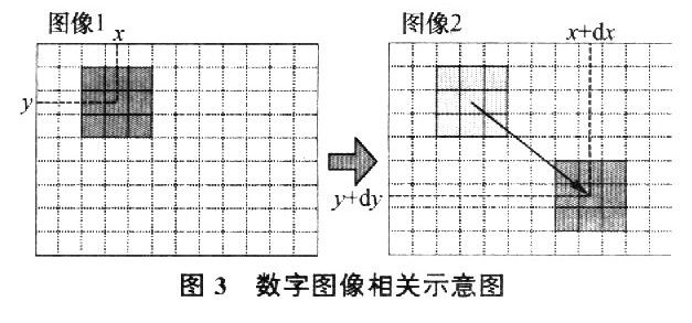 其取值范围为[-1,1]。其中:A(m,n)、B(m+i,n+j)分别为图像1中选取的模板的灰度分布和图像2上被移动的模板所覆盖到的区域的灰度分布,A、B为其平均灰度值。计算后在图像2上找到相关系数R最大的位置(x+dx,y+dy),所得的dx、dy即为像素级的运动位移。