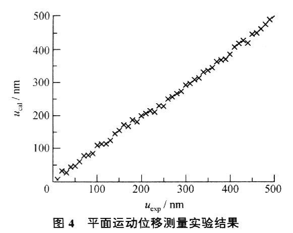 本实验通过测量装夹在高精度压电工作台上的微加速度计的微小移动来验证平面内位移算法的精度。CCD摄像机选用Sony公司的XC-ST50,像素数为768x 494,每个像素的大小8.4 μm9.8 μm,信噪比60 dB;图像采集卡选用NI公司的PCI-1409,10位灰度量化;显微镜物镜的放大倍数为25倍;此时CCD上每个像素对应于视场中336 nm392 nm大小的区域。三维压电工作台选用德国PI公司的P517.3CL,其x、y向的位移分辨率为1 nm,全程重复定位精度为5 nm,行程为100 μm100μm;由工作台定位引起的误差小于0.015个像素。图4为为验结果。