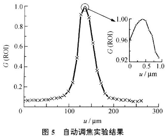 为兼顾调焦范围、调焦准确性和调焦速度的要求,本系统采用粗精结合的调焦策略。先用步进电机进行快速、粗略的焦平面位置搜索,并在搜索到的最佳点附近使用精密工作台的小步距z向移动进行高精度的定位,实现自动调焦的目的。