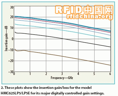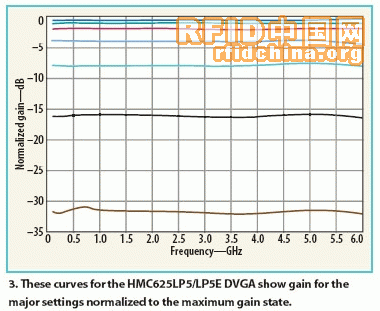 图2表示了主要控制状态下HMC625LP5 DVGA的最大增益与频率的关系。在图3中,将主要增益状态与频率归一化作为最大增益状态的参考,来突出在6-GHz宽带宽范围内所有增益(和衰减)状态下性能的一致性。