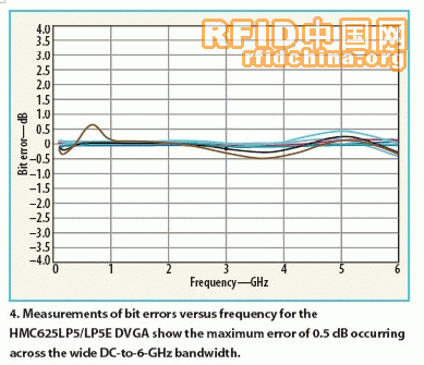 图3不仅表明了频率范围以上的相对状态均匀性,而且指出了可以实现的全部动态范围。图4给出了HMC625LP5 DVGA位误差数据与主要增益状态频率之间的关系。如图所示,位误差在频率和32-dB动态范围上从未产生超过+0.6dB幅度偏差。在6-GHz频率范围内其一般具有0.25dB的增益步长误差。