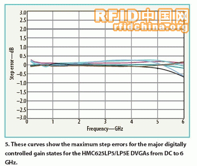 对大部分DVGA供应商而言,一个关键的设计挑战就是在整个频带内保持单调性(增益状态在频率上不重叠)和一致性(增益状态在频率上不能单独变得很大)状态关系的能力。图5表明,新的DVGA保持了具有数字增益设置的精确增益水平,并且对任何放大器模型在整个频率范围内具有从未超过+0.5dB最低有效位(LSB)的最高步长误差。这保证了不同增益状态之间的单调关系。在另一方面,保持一致性就是使得步长误差不超过大于LSB或-0.5dB的负水平。DVGA在其工作带宽内保持单调状态关系,否则增益状态将重叠并且数字逻辑输入可能不会导致预期的增益输出,这是极为重要的。正如图5所示,HMC625LP5 DVGA中,通用放大器在宽频率范围内表现出一致的性能