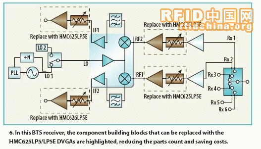 图6表示了基站收发器的模块图,突出位置表示DVGA。三个DVGA采用了32引脚5×5mm的表面贴装技术(SMT)封装。采用使用简单的50Ω放大器,无需外部匹配元件。